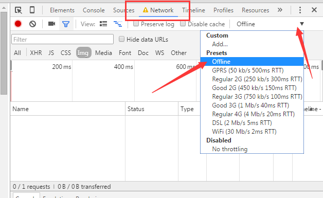 如何在浏览器中模拟无网络环境?(在 Network 中选择 offline)