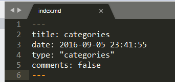 其实在配置了 categories 和 tags 后,还需要在 /source/ 目录下新建 categories 目录和 tags 目录,里面的要有 index.md 文件,并且文件开头不能少,也不能写错。